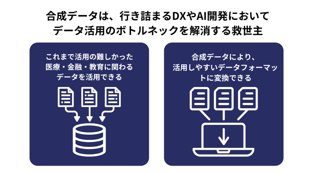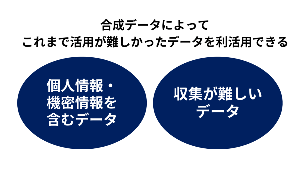 上記で何度も述べてきた通り、合成データの一番の利点としてはこれまで個人情報や機密情報により活用が制限されてきたデータが、そのような部分だけデータを差し替えて利用できる点にあります。合成データで人工的に作られることにより、プライバシーの保護、機密情報保護をしつつデータを活用できるという点が一番の利点と言えるでしょう。