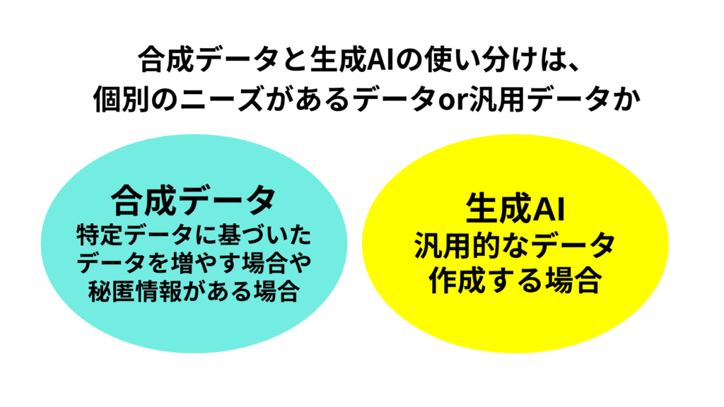 合成データはある特定のニーズで求められるデータセットの作成においてリアルなデータと同じ構造を持ちながら個人情報などを置き換えて利用できるものです。一方、生成AIはプロンプトに応じてニッチな作業が可能になっていますが、基本的には汎用型のAIであるため、個別のケースのデータ生成には向いていないことがあります。