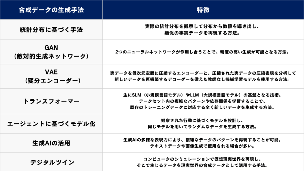 合成データを生成する方法には下記のような方法があります。
