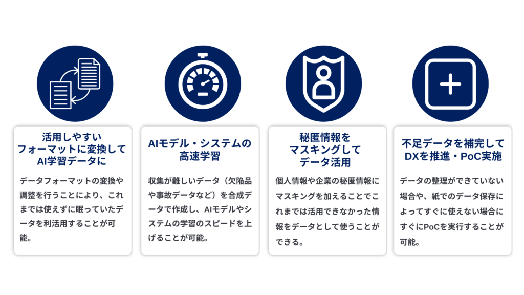 合成データの使用範囲は上記に挙げたものだけでなく、膨大なデータを使用して学習する場合には検討されることになるでしょう。ここではどういった場合に活用されるかという観点から代表的な4つをまとめて言及したいと思います。