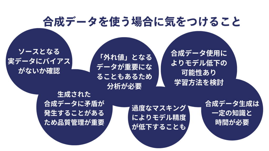 学習モデルに組み込む前に作成された合成データの品質のチェックが重要となります。あくまでも合成で作られたデータのため、品質が本物のデータに劣ってしまっている可能性があります。整合性が取れていないなどのデータ自体、データ間での矛盾が生じてくる可能性があります。