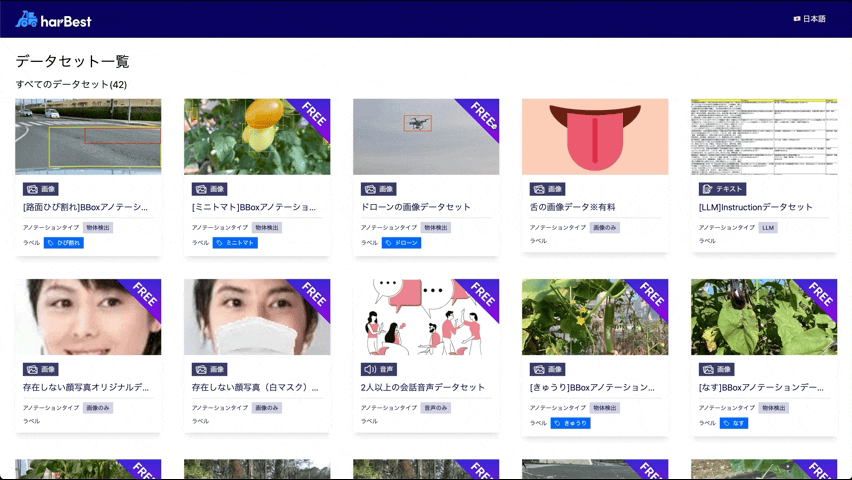 当社のプラットフォーム『harBest』は、「AI開発におけるデータ不足」を発端とした<収集/アノテーション/モデル開発>をお助けするサービスです。