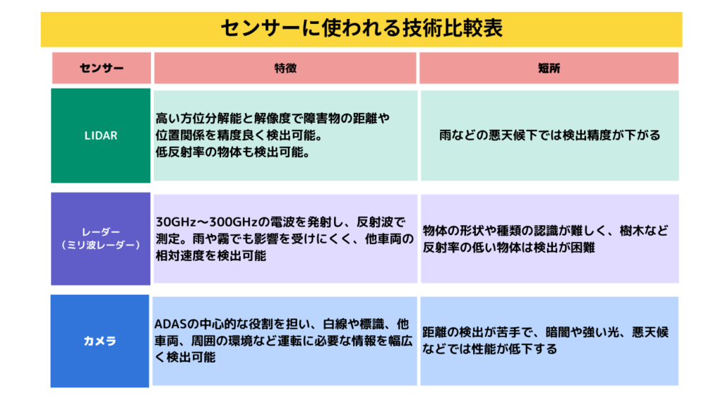 カメラ、ミリ波レーダー、LiDARの比較表