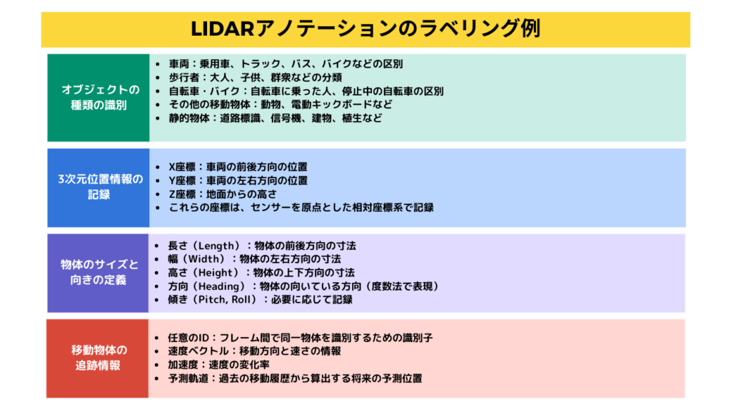 LiDARアノテーションは、LiDARが取得した点群データに意味づけ(アノテーション)を行う作業です。ここでは、例として、自動運転システムで使われるアノテーションのラベル名の一例を列挙します。