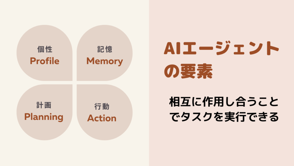 上記で述べたこれら4つの要素がそれぞれ相互に作用し合うことでAIエージェントが動くようになっています。