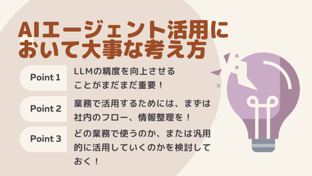 AIエージェントに任せる上でも、どのような作業を依頼するのか、または、意思決定の助けにするかなどは事前に決めた上での導入を図ると良いでしょう。